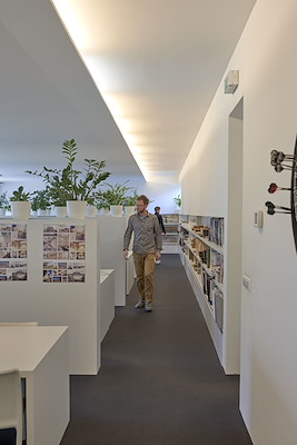 De renovatie van de toren en de nieuwbouw van het paviljoen is afgestemd op de behoefte van het bureau. Met een algemene werkruimte waar de medewerkers hun werk verrichten. En specifieke ruimtes voor het ontvangen van gasten, het geven van presentaties, het houden van vergaderingen en het werken in afzondering. De ruimtes zijn strikt van elkaar gescheiden door een transparant tussenlid waar tevens de toegang tot het kantoor is.
