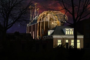 Ten aanzien van de monumentale ruimtes wordt voorgesteld het toegevoegde programma als vrijstaand volume van gebogen spanten in de kerkruimte te plaatsen, die te plaatse van de kap naar buiten ‘barsten’. Op die manier ontstaat een bruikbare ruimte op zolder voor de woning, maar ook een aankondiging naar de stad.