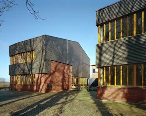 De drie kantoorgebouwen op het bedrijventerrein Hooggoorns in Emmen zijn gebaseerd op één volume, dat geïnspireerd is op de vorm van een boerenschuur. Om tot het uiteindelijke ontwerp te komen is dit volume op verschillende manieren bewerkt. Bebouwingsgrenzen van de kavel hebben aanleiding gegeven om een deel van de zuidzijde van het volume af te snijden. De noordzijde van het volume is schuin afgesneden om deze gevel gedeeltelijk naar de straat te keren, zodat de uiteindelijke kantoren ook vanaf de straat beter zichtbaar zijn. Deze bewerkingen van het basisvolume hebben tot gevolg dat er variabele “goothoogten” ontstaan. Het volume is daarna op twee plaatsen onderbroken, zodat er drie vrijstaande gebouwen ontstaan. Het resultaat van deze werkwijze is in de gerealiseerde gebouwen goed zichtbaar: de drie gebouwen laten zich nog duidelijk lezen als één volume, maar verschillen op subtiele wijze van elkaar. De indeling en materialisering van de drie kantoorgebouwen is vergelijkbaar. Aan de noordzijde is de gevel op de begane grond teruggelegd ten opzichte van de verdieping waardoor een overdekt entreegebied ontstaat. De stalen spanten van de schuur worden blootgelegd aan het begin van het entreegebied. De entreepui van het gebouw loopt overhoeks door en brengt licht in de hal van het gebouw. De rest van de begane grond is opgetrokken uit rode baksteen, die qua kleur herinnert aan de boerderijen uit de omgeving. De verdieping is bekleed met een staalbeplating als moderne variant op een rieten kap, waarvan het gesloten karakter doorbroken wordt door vensterstroken die, door hun diepe negge, dikte aan het materiaal geven.