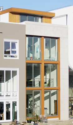 De constructie: De gevels zijn van prefab beton, het binnen en buitenspouwblad, incl. isolatie is zijn geheel in de fabriek vervaardigd. Het grootste paneel is 13x2,4m. De gevel is onderdeel van de constructie en aan de vloeren vastgegoten.