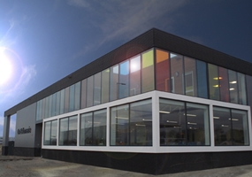 De glasachtige buitengevel van de kantoren op de eerste verdieping worden gedeeltelijk voorzien van gekleurde folies. Dit geeft een gereduceerd en geabstraheerd beeld waarmee het totaalbeeld een bedrijfseigen karakter krijgt.